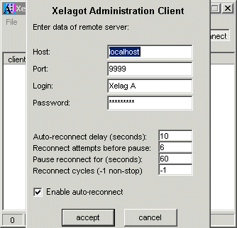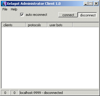 In here, I can input the host, port, login name and password to connect to the Xelagot Server. In this case, host is "localhost" because I have the server on my own computer, but normally it would look something like this: "14.210.7.49", or like this: "auth.myserver.com" (without quotes). When I hit 'accept', if the server is online, I get connected...