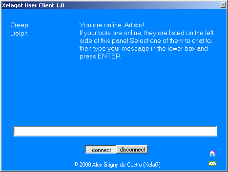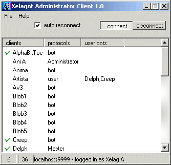 Online are AlphaBitToe (bot), Creep (bot), Delph (master, a bot with extended privileges) and possibly others down the list, including myself, who logged in as Xelag A (administrator). A right click on Artista....