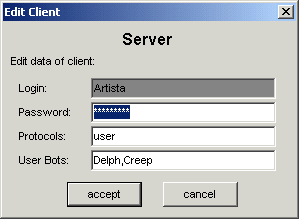 See, the login name is grayed out, so it can not be changed in edit mode. Other fields can be modified online. Artista is a User, a person who owns 2 bots on this server: they are assigned to her in the 'user bots' field. If she would log in now, using the User Client, she would see this: